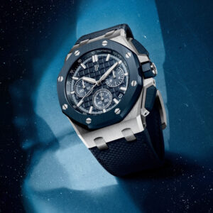 Весенняя новинка Audemars Piguet, которая делает ставку на контраст материалов. Средняя часть 43-миллиметрового корпуса, задняя крышка, основание заводной головки и гнезда под кнопки хронографа изготовлены из стали. Безель, заводная головка и сами кнопки хронографа сделаны из синей керамики. В цвет керамики выполнен и циферблат с рельефным узором Méga Tapisserie, что усиливает агрессивно-спортивный стиль часов.