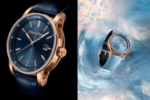 Два новых 38-миллиметровых референса с автоматическим подзаводом выполнены в радикально различающихся оттенках синего, создающих элегантный контраст с геометрическим корпусом из розового золота 750-й пробы. Эффект от многогранной архитектуры корпуса усиливает изысканное чередование сатинированных и полированных поверхностей. Обе модели снабжены ремешками из кожи аллигатора с крупным рисунком в тон к циферблату, создающими яркий двухцветный образ часов.