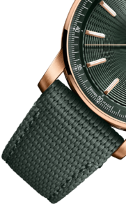 Зеленый циферблат, зеленые счетчики и внешняя зона цвета розового золота, зеленый счетчик у 6-часовой отметки, часовые метки и стрелки из розового золота с осажденным люминесцентным покрытием, зеленое внутреннее кольцо.
