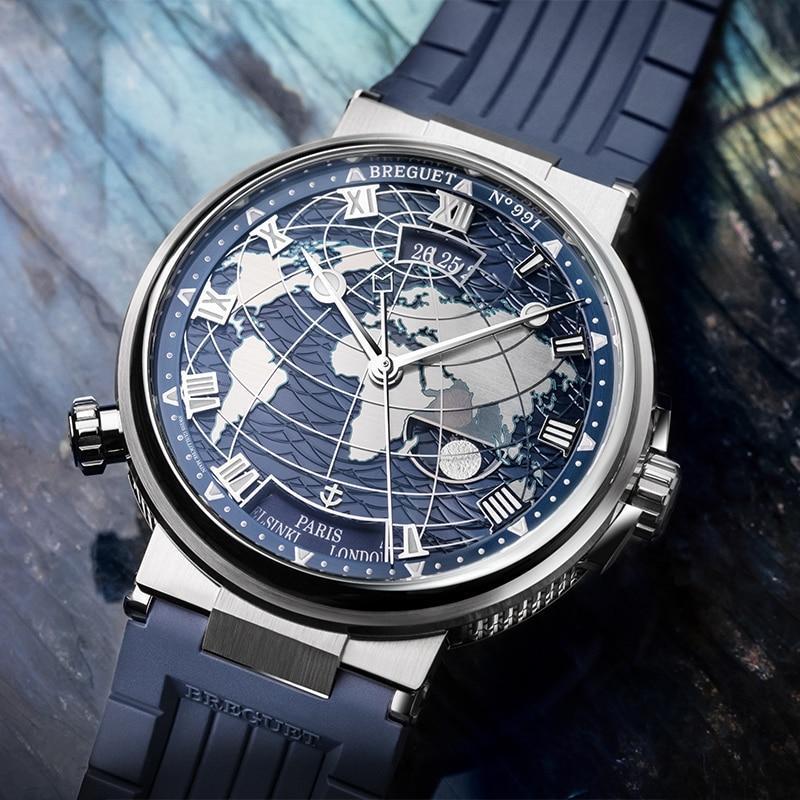 На циферблате изображена миниатюрная карта мира, образованная наложением нескольких пластин и созданная с использованием различных техник и материалов, Первая основа выполнена из золота и украшена гильошированным вручную узором в виде волн, разбивающихся о берега континентов. Отделка «солнечные лучи» на фоне бездонной синевы циферблата придает волнообразному — мотиву