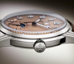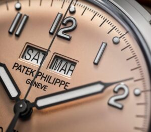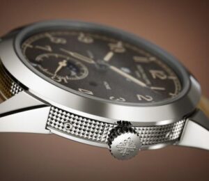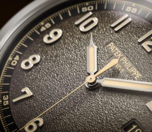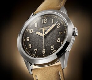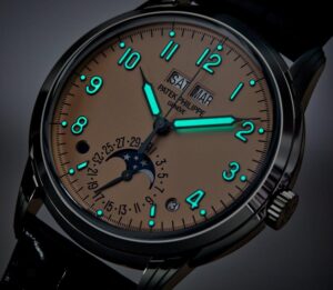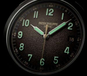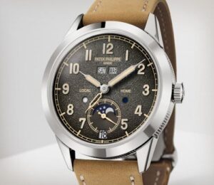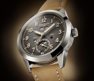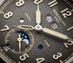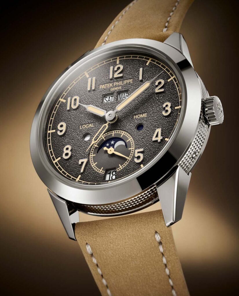 Patek Philippe впервые сочетает в себе запатентованный годовой календарь и систему отображения времени в пути. Техническая оригинальность этого годового календаря заключается в том, что в нем всегда указывается точная дата по местному времени. Чтобы обеспечить эту оригинальную функциональность, инженеры разработали новый механизм с автоматическим подзаводом и механизмом времени в пути, управляющим годовым календарем и обеспечивающим коррекцию даты как в прямом, так и в обратном направлении. На калибр 31-260 PS QA LU FUS 24H было подано не менее восьми патентных заявок, касающихся элементов, повышающих точность, эффективность, надежность, безопасность и удобство использования. Эта модель поставляется в новом футляре типа Calatrava, обрамленном гильошированным узором Clous de Paris. Циферблат в винтажном стиле отличается антрацитовым цветом и слегка зернистой фактурой, напоминающей старинные фотоаппараты. Этот новый артикул сочетается с двумя сменными ремешками: один из бежевой телячьей кожи с отделкой из нубука, а другой из черной телячьей кожи с тисненым мотивом из ткани и бежевой строчкой.