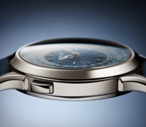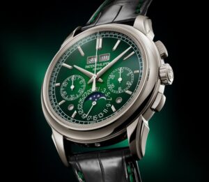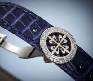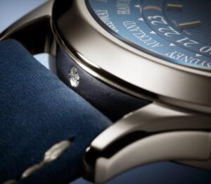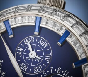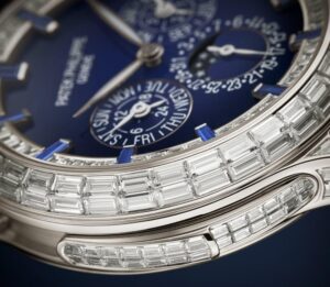 Patek Philippe блестяще интерпретирует модель Reference 5374 — сочетание двух популярных крупных усложнений — в новой платиновой версии Haute Joaillerie с лакированным синим циферблатом. Корпус с тонкой игрой изгибов вымощен бриллиантами багетной огранки, создающими светящийся геометрический узор. Вогнутый безель, украшенный двойным рядом багетных бриллиантов, образует идеальный круг. Фланец циферблата также инкрустирован багетными бриллиантами, а часовые метки — багетно-синими сапфирами. Этот оригинальный дизайн образует «амфитеатр» вокруг циферблата и создает впечатляющий эффект глубины. Таким образом, особо подчеркивается визуальный баланс показаний вечного календаря, показанных стрелками, выделяющимися на синем лакированном фоне с черной градиентной каймой. Его механический калибр R 27 Q с автоподзаводом оснащен механизмом минутного репетира, отбивающего два «соборных» гонга, почти дважды обернутых вокруг механизма, и производящих глубокий, насыщенный звук.