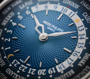 Потомок знаменитых часов Patek Philippe World Time, выпущенных в 1930-х годах и ставших культовыми образцами среди увлеченных путешественников и коллекционеров, — модель Reference 5230 была представлена ​​в 2016 году. Patek Philippe впервые интерпретирует эти космополитические часы в платиновом корпусе. в шоке с синим циферблатом и ремешком. Центр циферблата украшен новым гильошированным узором с повторяющимся узором. Ультратонкий механизм с автоматическим подзаводом и вращающимися дисками с двумя городами и 24-часовой шкалой служителя для одновременного и регулярного назначения времени во всех 24 часовых поясах.
