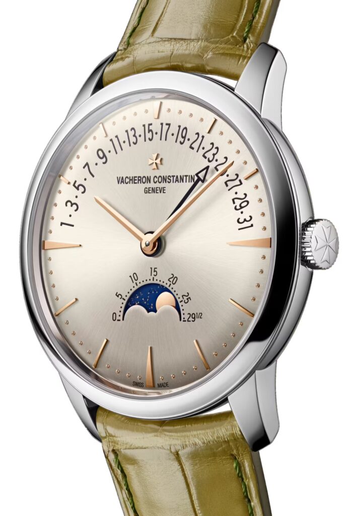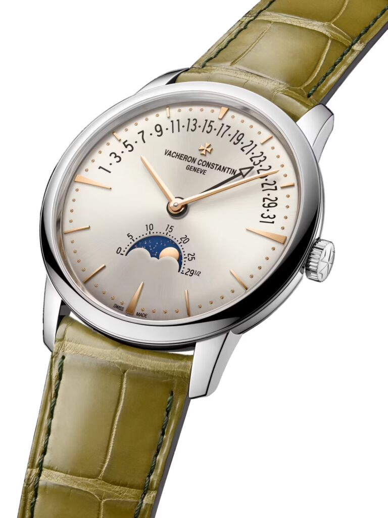Эти лаконичные оригинальные часы из белого золота 18 карат с точным указателем фаз Луны и ретроградным указателем даты обеспечивают удобное считывание показаний. Указатель фаз Луны, на котором изображены два лунных диска из полированного золота и усыпанное звездами небо, требует настройки лишь один раз в 122 года. Навеянные дизайном 1950-х годов стрелки и часовые метки вторят плавному изгибу циферблата. Новый ремешок свежего оливково-зеленого цвета придает часам подчеркнуто современный вид.