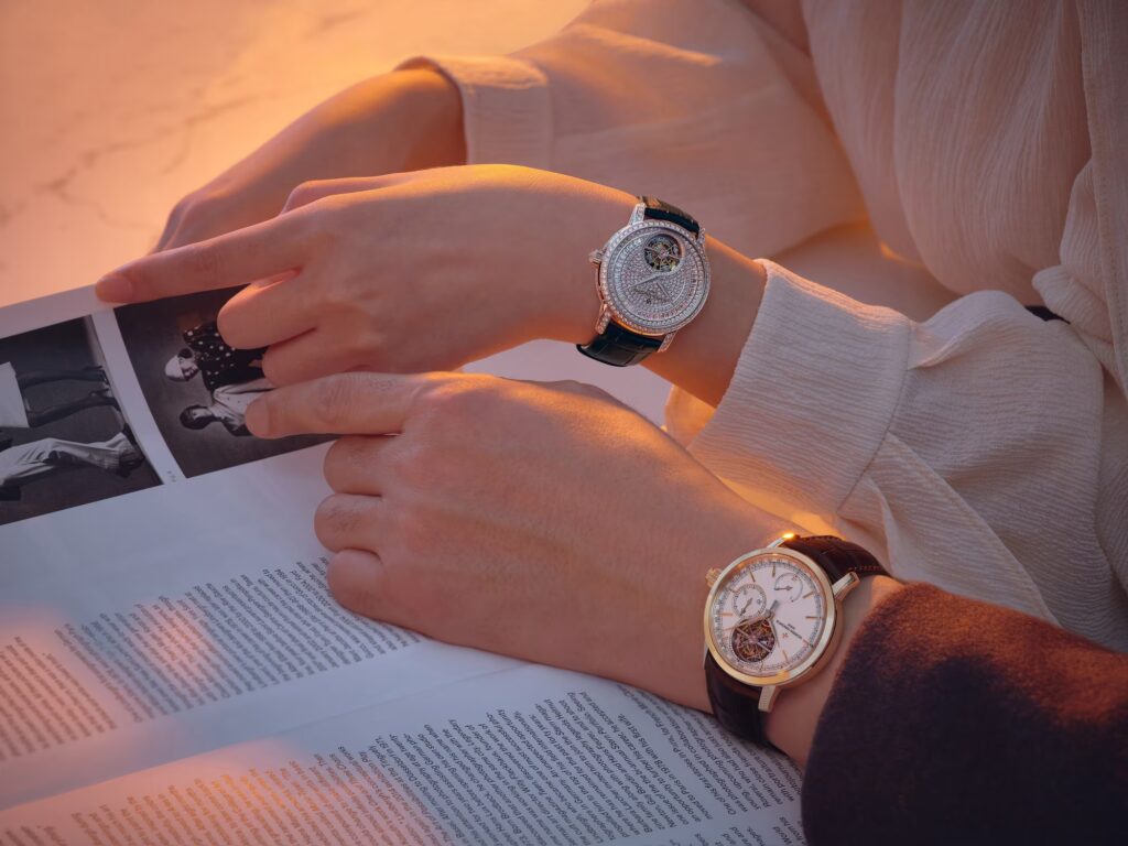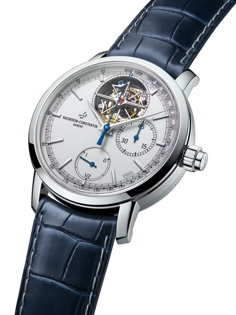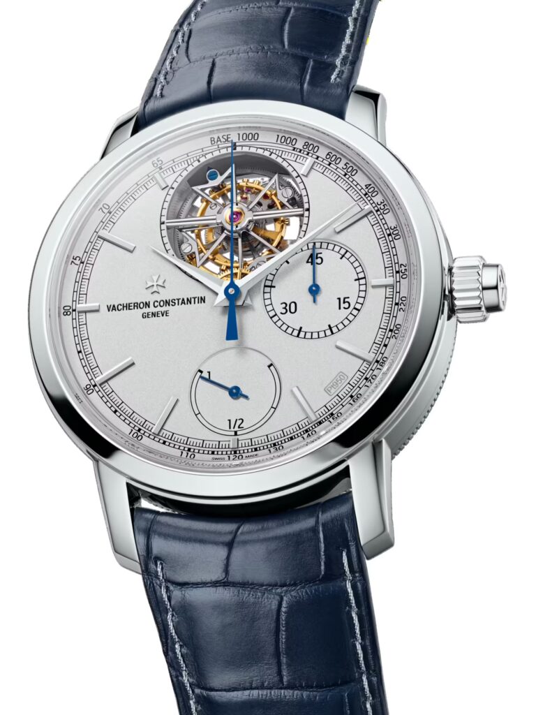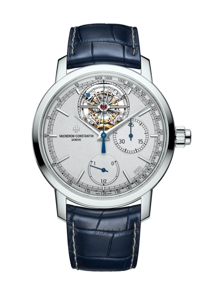 Эта модель линии Collection Excellence Platine, полностью выполненная из платины 950 пробы – корпус, циферблат, застежка и даже прошивка ремешка, – выпущена ограниченной серией из 50 экземпляров. В ней сочетаются два знаковых усложнения Высокого часового искусства: функциональный однокнопочный хронограф и безупречно выполненный турбийон. Каретка турбийона в форме Мальтийского креста в положении «12 часов» приводится в движение промежуточным зубчатым колесом, что позволило открыть взгляду большую часть механизма. Тахиметрическая шкала по периметру циферблата, дополняющая минутный счетчик в стиле «железная дорога», стильно обрамляет индикатор запаса хода в положении «6 часов» и 45-минутный счетчик на отметке «3 часа».