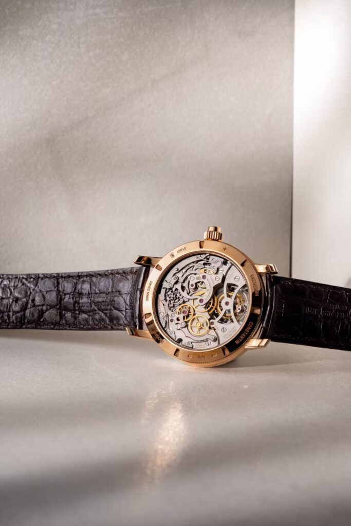В часах из розового золота 18 карат 5N сочетаются два усложнения Высокого часового искусства: мощь механизма однокнопочного хронографа и изысканность турбийона. Каретка турбийона в форме Мальтийского креста в положении «12 часов» приводится в движение промежуточным зубчатым колесом, позволяя увеличить размер отверстия для лучшего обзора. Украшающая окружность циферблата и дополняющая минутный счетчик в стиле «железная дорога» тахиметрическая шкала, является завершающим штрихом индикатора запаса хода в положении «6 часов» и 45-минутного счетчика на отметке «3 часа».