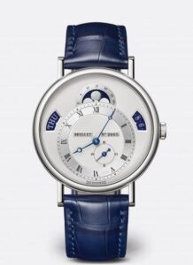 Часы линии Classique из 18-каратного белого золота с тонким рифлением на боковинах. Автоматический механизм с малой секундной стрелкой. Индикация дня недели, даты, фаз Луны и лунного цикла. Спираль из кремния. Смещенная часовая шкала. Циферблат синий, из 18-каратного золота, гильошированный вручную. Задняя крышка из сапфирового стекла. Водонепроницаемые до 3 бар (30 м). Ремешок: из синей кожи аллигатора с раскладывающейся застежкой из белого золота.