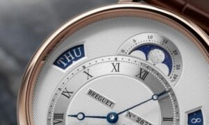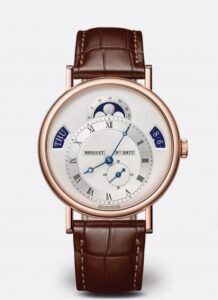 Элегантность, изысканность и чистота линий стали главными чертами новых часов Breguet, воплотивших современность и классическое наследие. Во всех моделях находит свое отражение многогранность декоративного мастерства Breguet. Смещенный от центра циферблат украшен изысканным гильошированным узором Clou de Paris, выполненным вручную мастерами Дома. На внешнем циферблате расположен узор «ячменное зерно». Указатель фаз Луны в положении «12 часов» привносит в дизайн реализм. Выполненную вручную Луну золотого цвета окружают облака с матовой поверхностью, подвергнутой пескоструйной обработке. Небо покрыто синим лаком, оно сияет переливами, открывая взору россыпь звезд. Часовые, минутные и секундные стрелки изготовлены из вороненой стали с наконечником в форме яблока в традициях Breguet. Окошки дня и даты расположены в положениях «2 часа» и «10 часов», соответственно. Их широкий формат обеспечивает превосходную видимость данных.