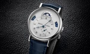 Часы линии Classique из 18-каратного белого золота с тонким рифлением на боковинах. Автоматический механизм с малой секундной стрелкой. Индикация дня недели, даты, фаз Луны и лунного цикла. Спираль из кремния. Смещенная часовая шкала. Циферблат синий, из 18-каратного золота, гильошированный вручную. Задняя крышка из сапфирового стекла. Водонепроницаемые до 3 бар (30 м). Ремешок: из синей кожи аллигатора с раскладывающейся застежкой из белого золота.