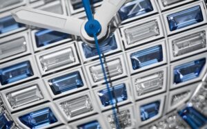 Центр циферблата выложен бриллиантами и синими сапфирами багетной огранки, образующими шахматный узор, который напоминает фирменный мотив Aquanaut. Минутная шкала образована чередованием меток из синих сапфиров багетной огранки и бриллиантов классической огранки, инкрустированных в технике закрепки «снег».