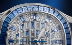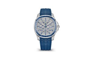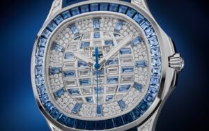 Центр циферблата выложен бриллиантами и синими сапфирами багетной огранки, образующими шахматный узор, который напоминает фирменный мотив Aquanaut. Минутная шкала образована чередованием меток из синих сапфиров багетной огранки и бриллиантов классической огранки, инкрустированных в технике закрепки «снег».