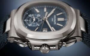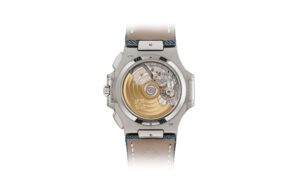 Хронограф Nautilus с автоподзаводом и функцией flyback выпущен в новой версии из белого золота с опаловым циферблатом сине-серого цвета. С изысканным оттенком циферблата превосходно гармонирует ремешок из телячьей кожи, стилизованной под деним. Он украшен контрастной белой прострочкой и дополнен раскладывающейся застежкой Nautilus из белого золота.