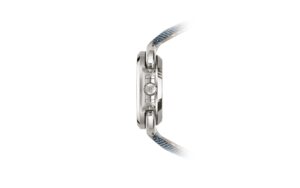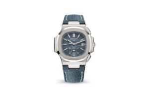 Хронограф Nautilus с автоподзаводом и функцией flyback выпущен в новой версии из белого золота с опаловым циферблатом сине-серого цвета. С изысканным оттенком циферблата превосходно гармонирует ремешок из телячьей кожи, стилизованной под деним. Он украшен контрастной белой прострочкой и дополнен раскладывающейся застежкой Nautilus из белого золота.