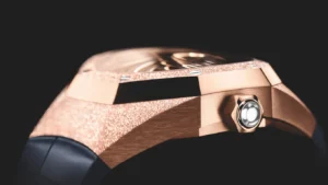 Легендарный восьмигранный безель модели Royal Oak из 18-каратного розового золота и верхние поверхности шестиугольного корпуса имеют специальный финиш. Ярко выраженный полированный наклон безеля резко контрастирует со сдержанным блеском. Наряду с сатинированными боковыми сторонами корпуса эти контрастные текстуры подчеркивают динамичную архитектуру Royal Oak Concept. Шестигранная заводная головка из розового золота, повторяющая форму фирменных шестиугольных стальных винтов на безеле, украшена полупрозрачным сапфиром огранки кабошон на кончике.