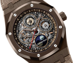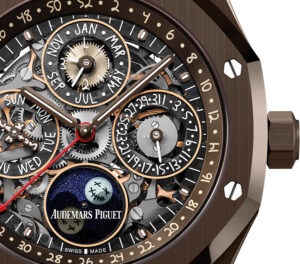 Travis Scott Royal Oak Perpetual Calendar, за исключением беспрецедентной коричневой керамики, идентична всем предыдущим выпускам: диаметр составляет 41 мм, а толщина – 9.9 мм. Безель сохранил традиционные шестиугольные винты из белого золота, а также плоское сапфировое стекло, защищающее циферблат, раскрывая здесь красоту скелетированного механизма собственного производства.