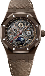 Сапфировый циферблат, дополнительные циферблаты в рамке из розового золота и календарные указатели с люминесцентным покрытием, светящиеся в темноте зеленым цветом, цифра 31 на счетчике в положении «3 часа», которая ночью становится синей, накладные золотые часовые метки и стрелки Royal Oak с коричневым PVD-покрытием и люминесцентное покрытие, синеющее в темноте, коричневый внутренний безель с недельной шкалой