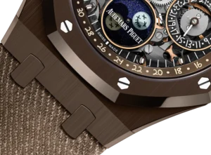 Модель Royal Oak Perpetual Calendar «Cactus Jack» интересна тем, что представляет собой нечто большее, чем просто изменение цвета циферблата, как это обычно происходит при выпуске ограниченных серий. Хотя модель Cactus Jack основана на стандартной модели, она имеет коричневый керамический корпус, а также типографику на циферблате, основанную на почерке музыканта, а также смайлик-эмблему Cactus Jack, изображающую луны.