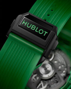 Hublot Big Bang Unico Green SAXEM оснащены соответствующим прозрачным зеленым каучуковым ремешком с линейной рифленой текстурой, проходящей вдоль внешней поверхности. Как и остальные модели текущей серии Big Bang Unico, ремешок крепится к корпусу с помощью фирменной системы One Click, которая позволяет пользователям быстро заменять ремешок, нажимая две кнопки трапециевидной формы, расположенные на корпусе верхнией поверхности встроенных ушек часов. Прозрачный зеленый каучуковый ремешок дополняется раскладывающейся застежкой из титана с черной отделкой.