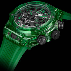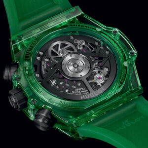 Среди всех разнообразных материалов, которые Hublot использует для создания своих часов, SAXEM – один из самых высокотехнологичных и необычных. Подобно сапфиру, SAXEM невероятно тверд и прозрачен, хотя цвета, которые можно получить с его помощью, более насыщенные и яркие, чем при использовании синтетического сапфира. Hublot впервые начал работать с SAXEM в 2019 году. Новые часы Hublot Big Bang Unico Green SAXEM, выпущенные ограниченной серией в 100 экземпляров, берут за основу основу 42-миллиметрового хронографа Big Bang и придают ему полностью прозрачную зеленую внешнюю структуру, которая распространяется как на корпус, так и на каучуковый ремешок.