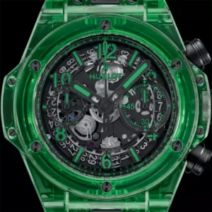 Имея скелетированный внешний вид с полированными черными элементами циферблата из композитной смолы, стрелки и рамки часовых меток выполнены в матово-черном цвете и заполнены специально разработанным люминесцентным материалом того же оттенка зеленого, что и остальные части часов. Помимо черно-зеленой цветовой гаммы, остальная часть циферблата во многом такая же, как и у стандартных 42-миллиметровых моделей Big Bang Unico, с секундным счетчиком в положении «9 часов» и скелетированным 60-минутным счетчиком хронографа в положении «3 часа», который также включает окошко даты на прозрачной поверхности регистра.