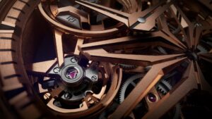 Artistic craft meets watchmaking and modern design. Enter the new Knights of the Round Table. Now, for the first time, the valiant knights from the legend of King Arthur are ready to challenge the invisible force of gravity by joining forces with Roger Dubuis’ signature complication, the monoturbillon itself. A monoturbillon displaying true technical prowess emerges from the center of the watch, showcasing advanced mechanics. Presented in a 45 mm rose gold 750/1000 case with a scalloped bezel, this artistic watch is certified by Poinçon de Genève.