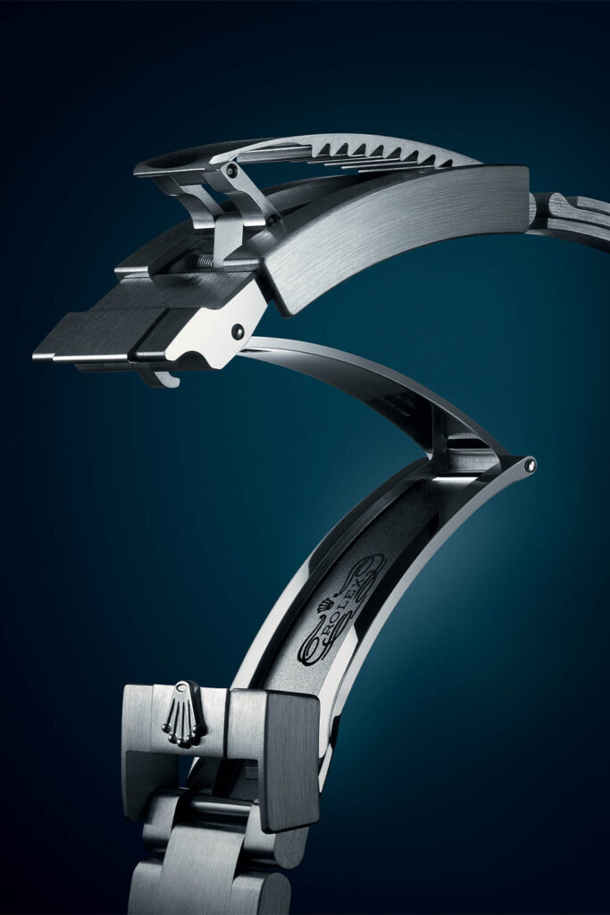 Изготовленный из титана RLX браслет Oyster часов Deepsea Challenge оснащен одновременно пластинами Fliplock и системой Rolex Glidelock. Сочетание двух систем удлинения позволяет надевать часы на гидрокостюм толщиной до 7 мм.